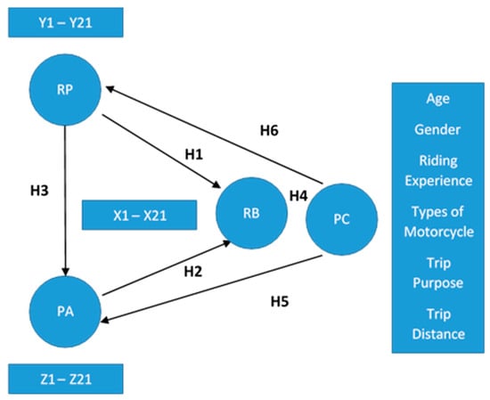 A statistical model was established based on the correlations between the latent constructs and the observed variables, according to the six hypotheses devised for the study. Personal characteristics of riders were also included in the model as a mediator to all three components. As personal characteristics have unique data types, their influence on each latent variable was not defined as having a positive or a negative influence. The developed model illustrated the general correlation among the latent components, which included risk perception (RP), positive affect (PA), risky behavior (RB), and personal characteristics (PC) acting as a mediator.