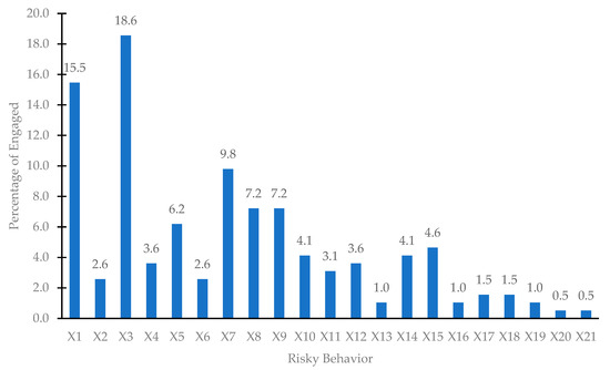 The most common risky behaviors were (X3) exceeding the speed limit and (X1) frequently switching lanes to overtake vehicles, represented by 18.6% of respondents and 15.5% of respondents, respectively, as illustrated in Figure 3.