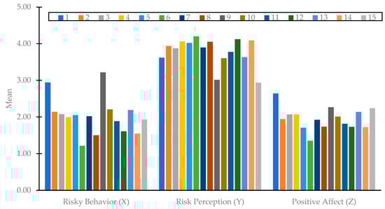 Figure 4 shows the mean value of self-reported risky riding behavior (X1 to X15), risk perception (Y1 to Y15), and positive affect (Z1 to Z15). Similar to the percentage of self-reported risky behavior, the mean of self-reported risky riding behavior illustrated in Figure 4 reveals that drinking alcohol before riding (X6) was the least common riding behavior among motorcyclists, with a mean value of 1.211. The results also reveal that most participants frequently rode during peak hours (X9) (mean value: 3.216).