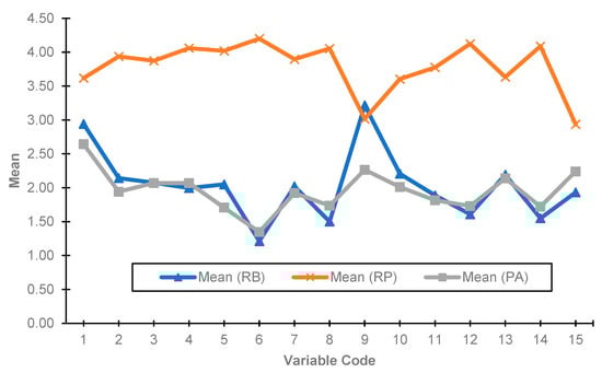 The mean values of all three measured constructs are compared in Figure 5. The results reveal that only behavior X9 (riding during peak hours) had higher mean values compared to respondents’ mean risk perception of this behavior (Y9), showing that a lower risk perception results in a higher engagement rate.