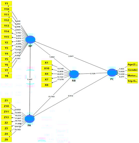 The assessment of the PLS-SEM model was conducted by evaluating the outer model by means of reflective and formative model/construct to assess the measurement model’s reliability and validity. In this study, RB, RP, and PA were considered reflective constructs, while PC was categorized as a formative construct. In the latent construct of risky behavior, five out of fifteen behaviors remained in the model. The risky behaviors included (X1), frequently changing lanes to overtake the vehicle in front, (X4), riding fast on a bend, (X7), running a red light, (X8), racing with other vehicles, and (X10), failing to keep an appropriate distance from other vehicles. Table 5 summarizes the findings after eradicating the indicators with low factor loadings (≤0.4) while meeting the recommended criteria of AVE (≥0.5) and composite reliability (CR) (≥0.6).