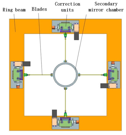 Most large ground-based reflecting optical telescopes follow Cassegrain optical design. The structural design of large telescopes often uses a single or multi-layer truss structure as the main support structure. The main structure integrates with welded ring beams, and quadruple wing beam structures support the secondary mirror chamber, as shown in Figure 3 []. Suppose the secondary mirror truss is integrated with the SMAM. The secondary mirror adjusts the secondary mirror trusses. This mitigation reduces the overall height and mass of the telescope and increases the resonance frequency.