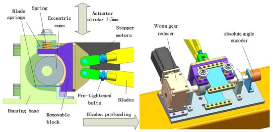 Based on the above kinematic modeling theory, a new dynamic secondary mirror truss adjustment mechanism is designed to replace the conventional Hexapod stage and adjust the secondary mirror’s attitude by adjusting the secondary mirror truss. This study involves a dynamic secondary mirror truss adjustment mechanism, including a ring beam, a secondary mirror chamber, eight blades, and four correction units. The ring beam is fixed to the truss supporting the secondary mirror, and its components (the four alignment units) are fixed to the four sides of the ring beam. Each alignment unit is connected to the secondary mirror chamber by two blades. The chamber blades are applied with a preload so that the blades experience some tension regardless of the position of the secondary mirror chamber. The alignment unit consists of a stepper motor, worm gear reducer, eccentric cam, blade spring, moveable block, and absolute angle encoder. Figure 4 shows the overall structure of this SMAM.