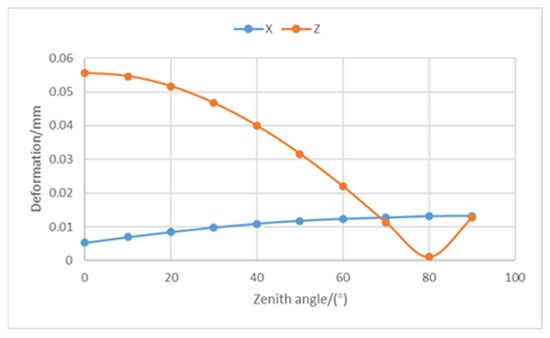 When the telescope is at different zenith angles, a statistical analysis of the model yields the secondary mirror chamber deformation curve in different directions with the zenith angle, as shown in Figure 7.