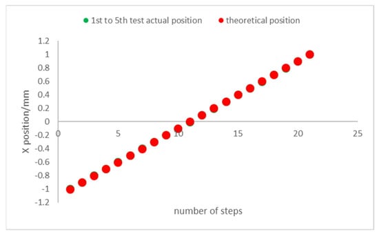 Figure 13 shows the results of the measurements in the z-direction. The number of drive steps is the horizontal coordinate, and the displacement measurement after each movement step is according to the vertical coordinates. The actual position of each measurement is shown as a green dot and the theoretical position with a red dot. The red dot of the theoretical position is placed above the green dot of the measurement result. The greener dots in the graph give the absolute error between the actual measured and theoretical positions. If the theoretical position coincides with the actual measurement position, the red dot at that position covers the green dot and is shown as a red dot.