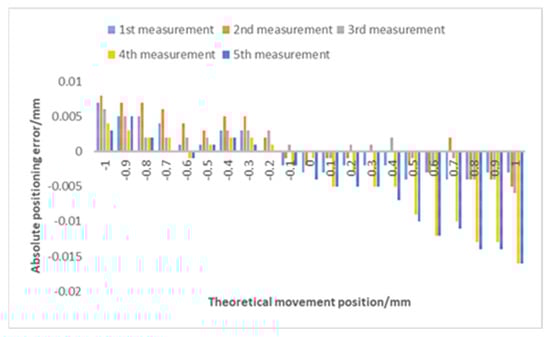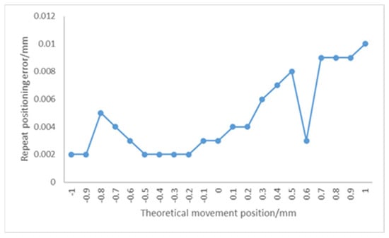 From Figure 14, the absolute positioning accuracy of the SMAM is better than ±0.016 mm in the z-direction. It starts from −1 mm and moves in steps of 0.1 mm within −1 mm ~ +1 mm. The absolute value of the repetitive positioning error at each position point can be obtained by processing the measurement results of the five repetitive movements, as shown in Figure 15.