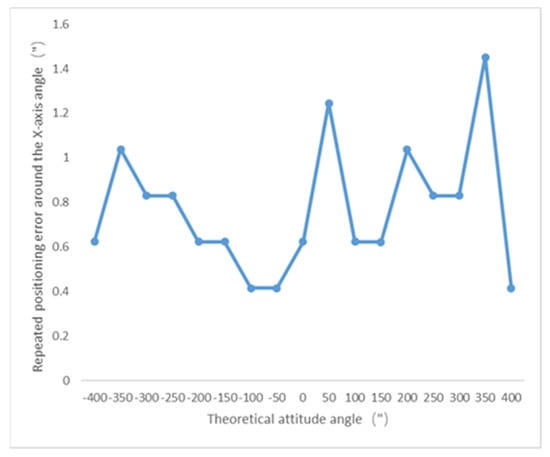 According to Figure 17, the absolute positioning accuracy of the attitude angle is better than 6.4″ when the deflection in the x-direction is in the range of −400″ to +400″. The measurement results of the five repeated movements are used to obtain the absolute error values of the repeated positioning of the deflection attitude angle in the x-direction, as shown in Figure 18.