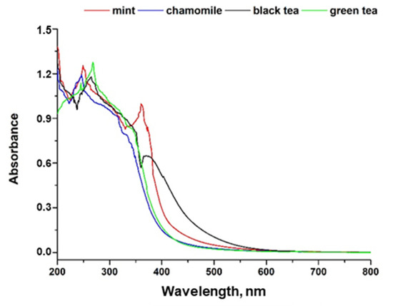 The UV–Vis spectra of examined infusions of mint, chamomile, black, and green teas.