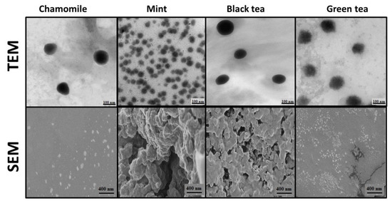 SEM and TEM images of the SeNPs obtained using chamomile, mint, black, and green tea extract. The synthesis was carried out in a reagent ratio of 2 to 1 (infusion/selenium).