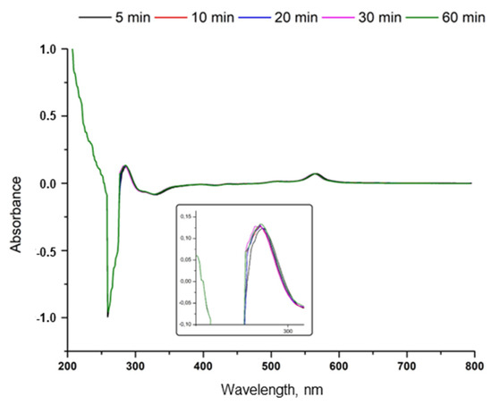 Recently, so-called selenized tea has become commercially available. It is a type of green tea originating from the Chinese province of Zhejiang, which, in addition to the health-promoting properties of tea, also contains significant amounts of selenium [54,55]. It can be assumed that if the infusion of this tea contains both polyphenolic compounds and selenium at the same time, SeNPs may potentially be synthesized there. The UV–Vis spectra of that green tea infusion were recorded against a blank sample which was a tea infusion without Se compounds (Figure 4).