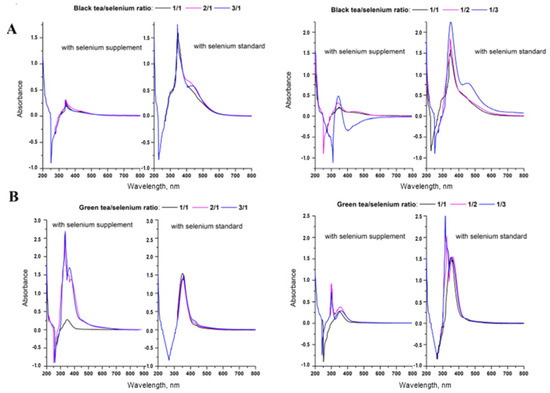 The UV–Vis spectra of black (A) and green (B) tea infusions mixed in different concentration ratio with selenium supplement or selenium standard.