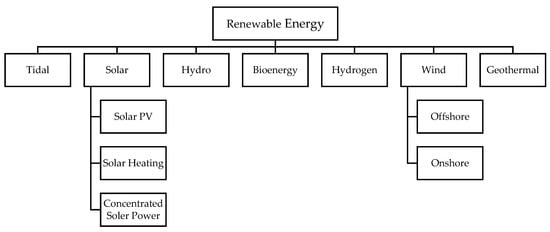 Renewable energy is a cumulative term used to describe the creation of electron flow in a system without using substances/resources that are finite. The various types of renewable energy sources [62] are shown in Figure 2. Commonly non-renewable energy generation is often termed fossil fuel generation [63]. It encompasses technologies such as coal-fired power stations, gas turbine power stations, integrated gasification combined cycle, and other syngas power stations that operate using finite resources, such as solid fuel in the form of coal, derivatives of crude oil (petroleum products), or natural gas.