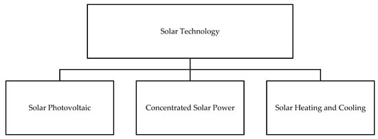 Currently, three technologies use solar energy: solar photovoltaic implementations, concentrated solar photovoltaic implementations, concentrated solar power—central tower/heliostat field, and parabolic trough, as illustrated in Figure 5.