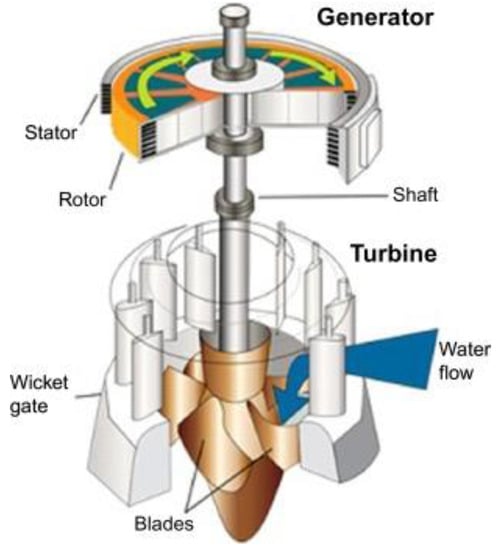 Hydropower generation uses the kinetic energy in moving water to spin turbines that, in turn, spin a generator that generates electricity, as shown in Figure 7.