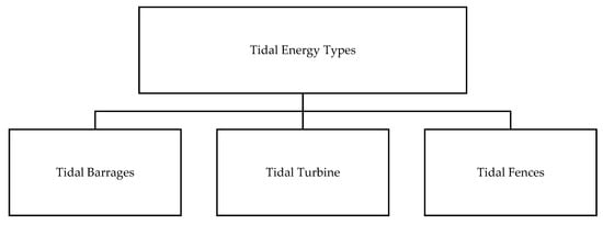 Tidal generation uses the ocean tides resulting from the Moon’s gravitational pull on the Earth. Although tidal energy is not widely implemented, it can generate enormous power. It is more predictable than solar and wind energy [72]. It is 80% more efficient than solar and wind energy. The requirement for tidal energy is a tide of about 7 m for proper operation and a good head of water to propel the turbine. Three types of tidal generation technology are currently in use, as represented in Figure 9 [73].