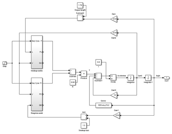 The simulation model is established in the Matlab Simulink software according to Equations (1) and (2), (8)–(10), Figure 3 shows the pneumatic artificial muscle-driven joint model, and the parameters used in the simulation are shown in Table 1. Gas source temperature is given in degrees Kelvin, pneumatic muscle initial length and single fiber length in meters, valve port circulation effective cross-sectional area in square meters, upstream inflation pressure in MPa, gas constant in N·m·kg−1·K−1, connecting rod length in meters, load mass in kg, joint radius in meters, and damping factor in N·s·m−1.