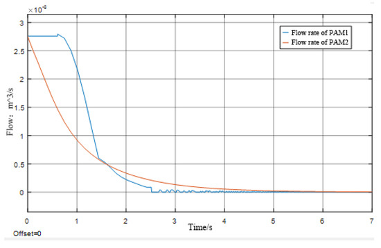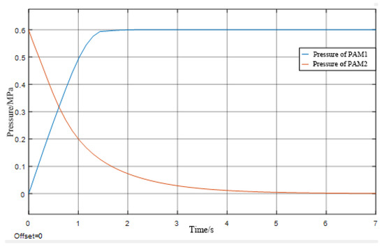 The pneumatic muscle can be analyzed in Figure 8 and Figure 9 to show that the maximum contraction force is 670 N when the joints are pulled against each other, which means that the single joint can be loaded with 67 kg. Since the simulation initially mimics PAM1 pulling PAM2 unilaterally in a pressure-holding state, the contraction side is inflated for some time and then stops. In contrast, the pressure-holding side is deflated slowly and regularly. The model, as shown in Figure 9, is consistent with reality.