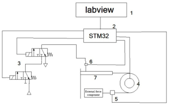 General schematic diagram of the lab bench: 1—Labview upper computer; 2—STM32 lower computer; 3—two-position three-way solenoid valve; 4—angle encoder; 5—tension sensor; 6—compression sensor; 7—pneumatic manual muscle.