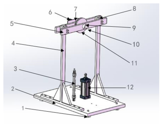 Three-dimensional model of the experimental stand:1—Foot squat; 2—Base plate; 3—300 mm pneumatic muscle; 4—Left and right brackets; 5—Middle beam; 6—Angle encoder; 7—Angle encoder bracket; 8—Beam spacer; 9—Flange bearing; 10—Shaft; 11—Timing belt pulley; 12—Cylinder.