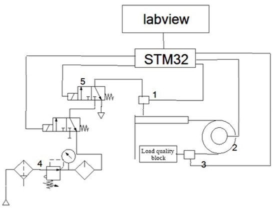 The general schematic diagram of this pneumatic artificial muscle control experiment bench is shown in Figure 15. The three experimental parameters to be measured are the external force part, the pressure of the pneumatic artificial muscle, and the length of the pneumatic artificial muscle. Among them, the external force part can be connected using another pneumatic artificial muscle to conduct the pull-off experiment; the external force part can also be connected to an external load. The external load is applied in two ways: one is obtained through the solenoid valve to control the cylinder expansion, and the other is obtained by adding a mass block at the end of the external force part; changing the number of mass blocks can be achieved by changing the size of the external force, which the tension sensor can measure. A pressure sensor reads the magnitude of the internal pressure of the pneumatic muscle. The original length of the pneumatic muscle is 300 mm, and the change in length can be calculated by measuring the angle of rotation of the timing pulley with an absolute angle encoder. The lower computer, STM32, collects the rotation angle value through the encoder. Then, after ordering, the STM32 sends the collected data to the upper computer, built by the LabVIEW software.