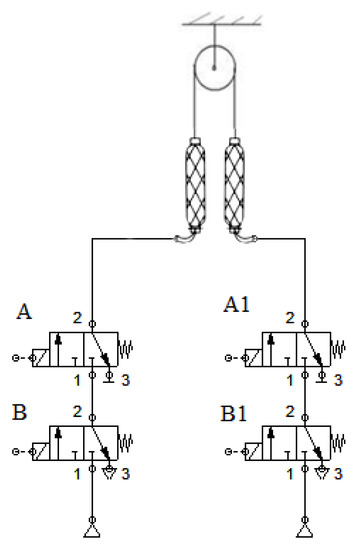 (1) System initialization; To simplify the experimental steps as much as possible, first, the two pneumatics were simultaneously manually inflated and adjusted to the same pressure; that is, the two pneumatic muscles are full of gas. After that, the fixed pulley will be adjusted to the middle state;