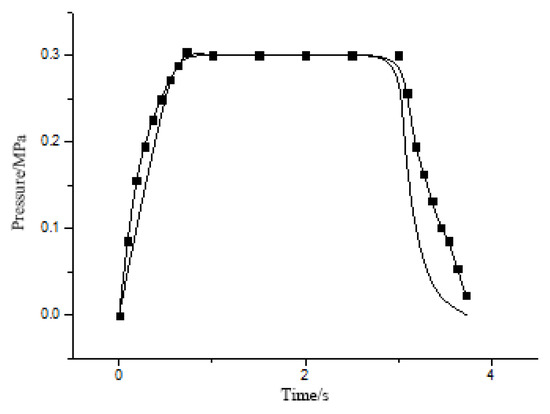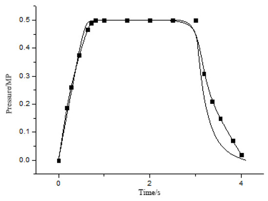 The experimental plots of dynamic characteristics are shown in Figure 22, Figure 23, Figure 24, Figure 25, Figure 26, Figure 27, Figure 28 and Figure 29, where Figure 22, Figure 23, Figure 24 and Figure 25 show the variation of pneumatic artificial muscle length with time, and Figure 26, Figure 27, Figure 28 and Figure 29 show the variation of internal pressure of pneumatic artificial muscle with time. The plot lines with black dots in the figures are the experimental data curves, and the smooth curves are the simulation curves.