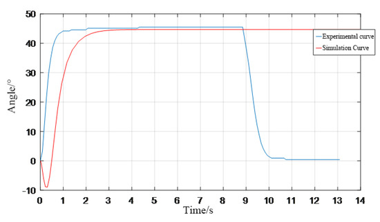 Figure 30 shows the simulation for 45° and the experimental 45° control step response graph; as can be seen in the graph, there is consistency between the two transients. Still, the simulation curve is relatively more lagging, about 0.5 s; considering that the damping of the pneumatic artificial muscle may be too large, the signal curve response lag has some impact.