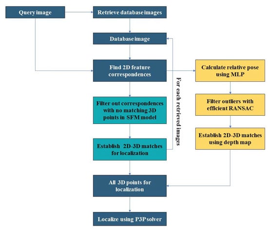 Figure 1 shows the differences between the general hierarchical localization method and DLALoc method. Dark blue and cyan flow is the method proposed by [5]. In this method, the last step of estimating a query image pose is based on the P3P method [39]. Using RANSAC to perform robust pose estimation inside a P3P method is the most time-consuming step in the whole pipeline of this visual localization method. In order to release the burden of this step, we proposed DLALoc, which is illustrated as dark blue and yellow flow. Same as [5], DLALoc is still structure-based and the first step is to retrieve the most relevant database images. Then, the 2D–2D feature correspondences are calculated through some feature matching strategies. Different from [5], we do not obtain these 2D–2D correspondences directly from these feature matching strategies, which contain many outliers. Instead, we use a pretrained MLP that models the 3D structure of the scene to filter outliers of 2D feature correspondences, thereby establishing more robust 2D-3D matching pairs in the next step. The filtration of outliers is based on optimal relative pose estimation of two images (i.e., a query image and a database image) with RANSAC. We find the maximum 2D correspondence set whose reprojection error on another image according to epipolar constraint is under the threshold. Moreover, by using the mesh to represent the scene, we could obtain the 2D–3D matching pairs from the rendered depth map, and these 2D–3D matching pairs are more precise than Sfm model. Thus, we take advantage of this property, and propose to use the scale consistency to a step further help us to filter out the outliers. To be specific, the different depth information of five 2D–3D matching pairs between the depth map and output from the MLP can give a preknowledge of whether the relative pose has been accurately calculated or the input to calculate the relative pose contains outliers. In this way, we can skip the inner validation step of some wrong solutions to perform a more efficient RANSAC and obtain robust 2D correspondences in a short time.
