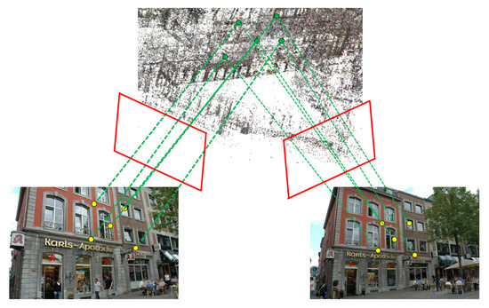 Moreover, the database point cloud is usually generated from the structure-from-motion (Sfm) process and the scene is presented with this point cloud and images [12,13]. A dense 3D model scene representation [14,15,16] is a replacement for using sparse Sfm point clouds and images. This representation uses the mesh generated via multiview stereo, Lidar or depth map to represent the scene which is more flexible at feature point types because it does not need to match local features between database images to triangulate the 3D point cloud. The 3D point can easily be obtained from the depth map rendered from the mesh. More importantly, this rendering process will not provide wrong 2D–3D matches compared with the 3D point cloud from the Sfm model.