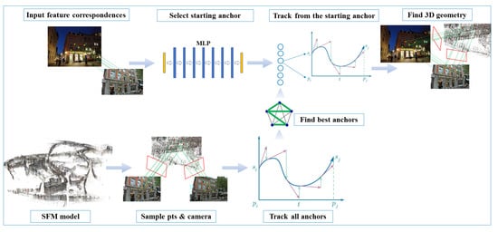 The core idea of our approach is summarized as follows. With the mesh-based scene representation, the 2D–3D matches contain no mismatch. We use the pretrained MLP combined with homotopy continuation to calculate the relative pose in a short time. We also use the scale information from rendered 2D–3D correspondences to help the RANSAC to perform more efficiently. In such a way, we can get more robust 2D–2D correspondences in a short time. Thus, the 2D–3D matches established by these 2D features are also more robust. The performance of the algorithm can be greatly improved using such an approach.