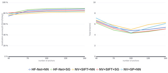 We first evaluate the performance of our localization algorithm to fit different global features, local features, and feature matching strategies. we conducted experiments on learned and traditional local features (SuperPoint [42] and SIFT [43]) based on images extracted by NetVLAD. Then, the features can be matched by NN [37] or SuperGlue [38] method. We call them NV+SP+NN, NV+SP+SG, NV+SIFT+NN, and NV+SIFT+SG. Next, we evaluate a more efficient method that simultaneously computes local and global features using HF-Net [5] on our method, with the same matching strategy. We call them HF-Net+NN and HF-Net+SG. We set different numbers of anchors and RANSAC sampling times to show how the different MLP and RANSAC parameters could affect the efficiency and accuracy of the localization algorithm.