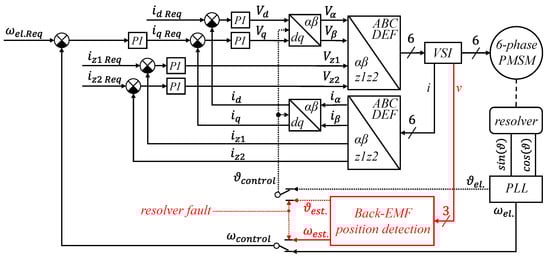 Sensorless control represents the replacement of the speed/position sensors. The replacement can be permanent, usually for reasons regarding price and space reduction. Sensorless control can also be used as a backup during speed/position sensor failure [9]. In this case, sensorless control is in temporary, emergency operation. The sensorless control of permanent-magnet synchronous machines for low-speed regions utilizes high-frequency signal injection with salience tracking algorithms, which has been applied in [10] to a six-phase PMSM. For middle- and high-speed regions, back-EMF observers are the standard solution [11]. Observers belong to model-based sensorless control techniques, which makes them sensitive to changes in parameters. Stator winding resistance is highly dependent on temperature changes. Synchronous inductances change significantly with the saturation of the magnetic core. The EMF constant changes with temperature and can also be influenced by the flux-productive component in the field-oriented control. The inertia is difficult to define or measure for real complex systems and changes with changes in the system mechanically coupled with the machine. The standard Luenberger-type back-EMF observer in the γδ reference frame has been applied to a six-phase PMSM in [12]. This paper focuses on middle- and high-speed sensorless control for a six-phase PMSM, utilizing a new procedure that can be applied to multiphase electric drives as a promising alternative to back-EMF observers. The proposed method is similar to the search coil method, where an additional winding is placed in the stator [13]. The search coil usually has only a few turns with a small cross section and represents the inbuilt resolver. With the method proposed in this paper, additional sensors such as search coils and resolvers are not required, and one three-phase set of the six-phase stator winding is utilized instead. The proposed method is applicable to multiphase permanent-magnet synchronous machines. A six-phase PMSM with field-oriented control (FOC) and the vector space decomposition (VSD) method [14] have been utilized in this work. The speed and the position of the rotor are obtained via the resolver in healthy conditions (Section 5), and via the novel sensorless procedure in the case of resolver failure (Section 6). In an emergency operation, the drive continues with reduced power since only one three-phase winding is utilized for torque generation, while the disconnected winding is used as the back-EMF sensor. The drive can also operate at the nominal power if the system is designed for the overload conditions, which usually applies to discontinuous operation.