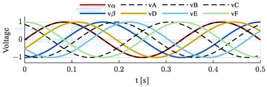 The control structure is still in the VSD form (Figure 1). However, specific modifications are required. The control of the z1–z2 subspace is turned off by setting voltages Vz1 and Vz2 to zero. Currents in the z1–z2 subspace behave as defined in (16) and (17), considering the second α–β subspace to be equal to zero. The coefficient K in (14)–(17) is changed to K = 1, so the control remains amplitude-invariant, and the coefficient of proportion changes to 2/3. The torque constant is then, according to (11), reduced to half. Based on (1)–(9), synchronous inductances of the VSD model Ld and Lq are changed to the synchronous inductances of the first three-phase system Ld1 and Lq1 (3). Modified values of parameters are used for the readjustment of the FOC controllers. Supply voltages and currents flowing through phases D, E and F are now zero. The measured voltage (Figure 12) then theoretically corresponds only to the back EMF produced by the flux of permanent magnets. The elimination of the supply voltage with the third harmonic from the measured voltages can be seen in the frequency spectra in Figure 13. The remaining third and fifth harmonics are generated with the EMF of the machine, but also through the armature reaction.