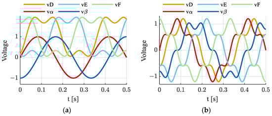 Simulation of the transformation between phase coordinates D–E–F to the stationary α–β subspace at the zero-position reference frame: (a) basic harmonic with the third harmonic and the DC offset; (b) basic harmonic with the fifth harmonic.