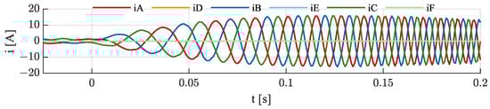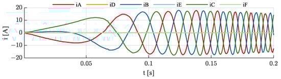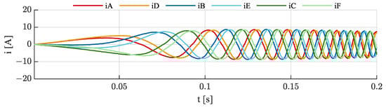 The healthy operation of the six-phase PMSM drive is presented in Figure 5, Figure 6, Figure 7, Figure 8, Figure 9 and Figure 10, followed by the back-EMF investigation in the three-phase operation (Figure 11, Figure 12, Figure 13 and Figure 14). In this case, the speed/position feedback is obtained from the resolver (sensor-based control).