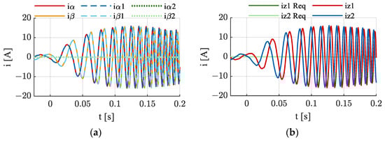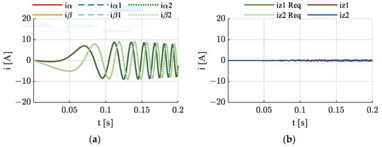 Current in transformed subsystems during the startup transient of the emergency three-phase operation: (a) α–β subsystems; (b) z1–z2 subsystem.