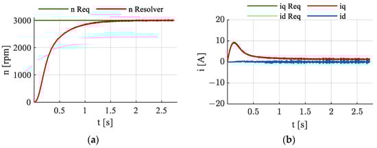 The startup in the speed loop control from 0 to 3000 rpm is shown in Figure 7a. The maximal current of the machine is 19 A, so the dynamic of the speed controller for the standard six-phase operation can be set higher, as shown in Figure 7b. However, the dynamic has been set according to the three-phase operation, wherein the startup current reaches the maximum, as shown in Figure 11.