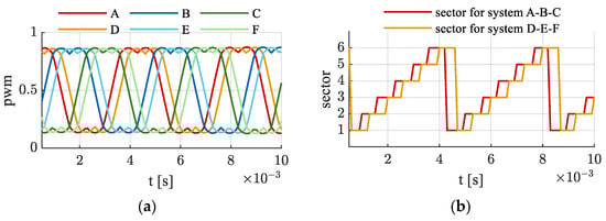 Double zero-sequence SVM during the steady-state six-phase operation: (a) PWM references; (b) SVM sectors.