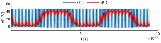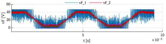 The PWM references with the third harmonic are also beneficial in this experiment for the recognition of the source voltage’s influence on measured voltages. Voltage measured with an oscilloscope on phase F is shown in Figure 9. The DC-bus voltage of the application is 45 V, which corresponds to the PWM pulses measured on the phase connector of the power inverter (vF_1). The voltage signal is then filtered with hardware filters and amplified by an operational amplifier (vF_2). The voltage signal is sampled by a microcontroller (vF), which is shown in Figure 10. Measured voltages are a combination of the power supply voltage and the back-EMF voltage, so the estimated position from this operation does not correspond to the actual electrical position of the rotor flux.