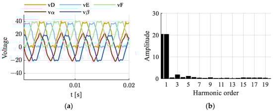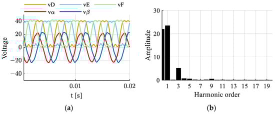 Measured voltages during the steady-state six-phase operation: (a) measured phase voltages and their transformed α–β components; (b) frequency spectrum of the measured voltage vF.
