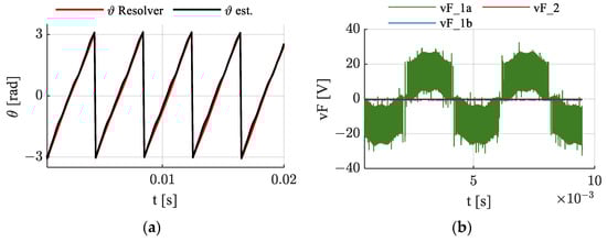 The position (Figure 14a) has been estimated from transformed α–β components (Figure 13a) using the PLL method shown in Figure 2. The third harmonic and the DC offset have been separated during the transformation, which does not apply to the fifth harmonic, as can be seen in Figure 13a. This fact confirms the results from Figure 4. The utilized PLL has a filtrating characteristic. Harmonics of the orders 6k ± 1 (k = 1, 3, 5, …) and 12k ± 1 (k = 1, 2, 3, …), which are not segregated during the transformation process, are damped with the PI controller in the PLL structure. However, to keep the dynamic of the observer useful for control procedures, the damping property cannot be set too high, and the remaining harmonics can appear at the observed speed and position. Therefore, the proposed method is more appropriate for machines with a negligible fifth harmonic of the EMF. The switching frequency can still be observed in the measured voltage (Figure 12). The machine winding of the second system D–E–F has been physically disconnected from the inverter to identify the source of this signal, which is possible in the sensor-based three-phase operation (Figure 14b). The voltage has been measured separately on the machine winding (vF_1a) and the connector of the inverter (vF_1b). The signal with the switching frequency is generated through the machine, and the source is the first set of the active stator winding A–B–C.