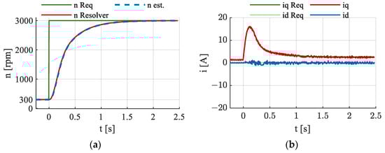 The emergency three-phase operation is shown in this part of the paper. A resolver fault is assumed. The control procedure is the same as the three-phase operation mode described in the previous section, except for the speed/position feedback, which is now obtained from back-EMF voltages measured on the winding of the second system D–E–F. The results for sensorless control are presented in Figure 15, Figure 16, Figure 17, Figure 18, Figure 19 and Figure 20. The value of the back EMF is proportional to the rotor speed, so the proposed method does not work in the low-speed region. This technique is based on the phase angle of measured voltages, and the position of the measured three-phase signal is unrecognizable in the noise if the amplitude is small. The results of the acceleration from 300 rpm to 3000 rpm are shown in Figure 15, Figure 16 and Figure 17. Data from the resolver are shown in Figure 17, Figure 19 and Figure 20 only to verify the correctness of the estimated speed/position, and they are not used in the control algorithm. The startup shown in Figure 17 has been executed for no-load conditions.