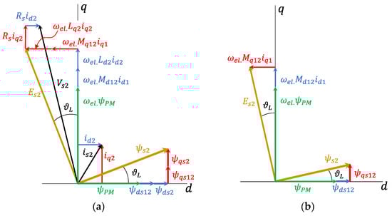 As follows from the mathematical model (1)–(4), the increase in the stator current in the active winding generates an induced voltage in the disconnected winding. This state creates a phenomenon called the armature reaction. The position of the measured voltage represented by the space vector Es2 is displaced from the actual rotor flux position by the load angle ϑL, as shown in Figure 18 [19]. The armature reaction is compensated, as described in (19) and (20), where the flux-producing component of the stator current is considered to be equal to zero.