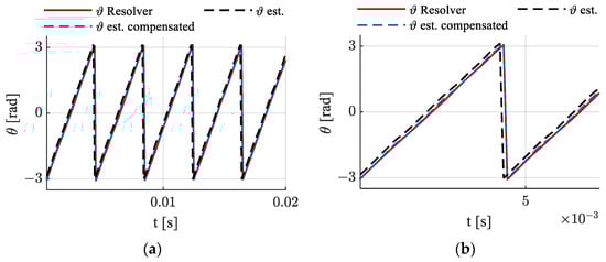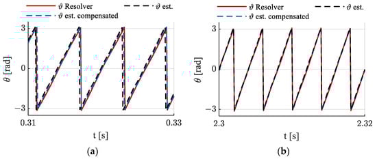 The position behavior corresponding to the no-load startup (Figure 17) is shown for the transient at approximately 2000 rpm in Figure 19a. The steady-state operation at 3000 rpm is presented in Figure 19b. The next test was performed at the steady-state 3000 rpm operation, where the mechanical load was increased by the DC machine with 0.5 kW power coupled mechanically to the tested six-phase PMSM. The load torque is at the level corresponding to 9 A of the stator current in the three-phase operation of the six-phase PMSM.