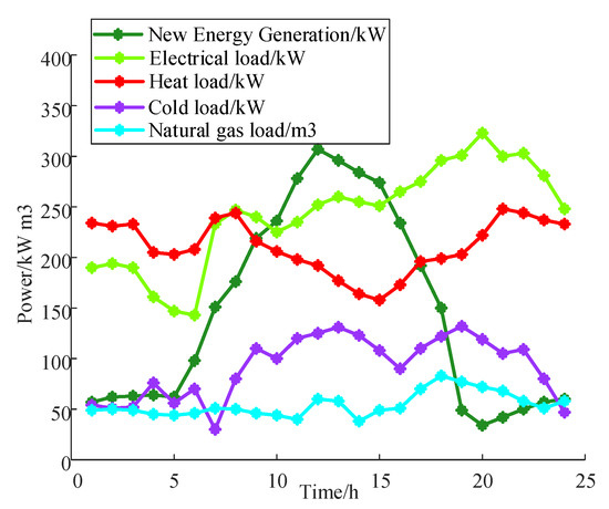In this paper, the typical daily load data of a park are selected, and the structural model diagram of an electricity–gas integrated energy system shown in Figure 1 is used for simulation analysis, and the parameters of each piece of equipment are shown in Table 1 [49,50,51,52]. The system’s new energy generation and load forecast data are shown in Figure 2, using peak and valley tariffs as shown in Table 2. In this paper, a particle swarm algorithm is used to simulate and analyze the optimal dispatching model of an integrated electricity–gas energy system to minimize the daily operating cost of the system.