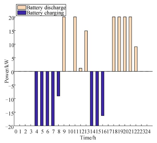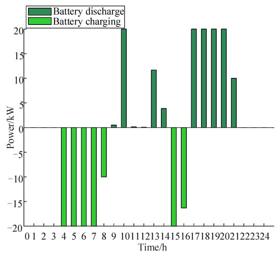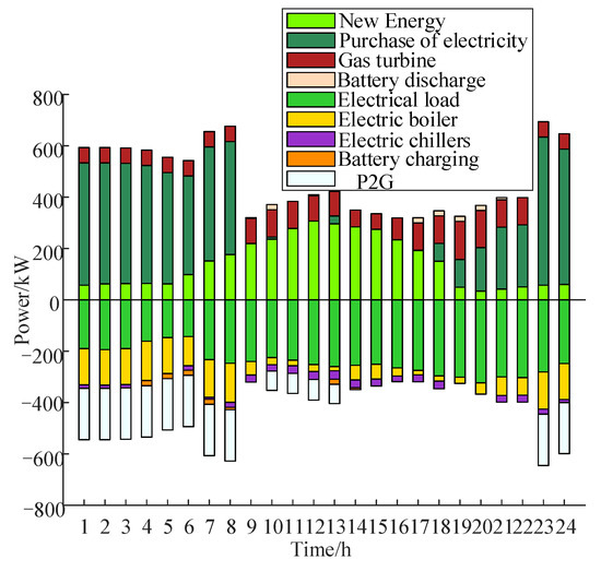 From Figure 3, it can be seen that during the valley tariff period, the new energy output is not enough to provide the electric load required, so it is necessary to purchase power from the grid, and the battery is charged at this time so that it can be discharged during the peak tariff period to reduce the power purchased from the grid; during the peak tariff period, the new energy and gas turbine coordinate to supply power, and when the new energy output is insufficient, the battery starts to discharge to provide the rest of the required power together with the gas turbine.