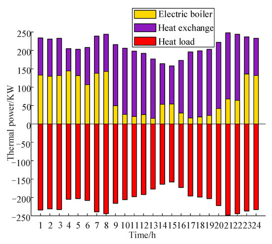 From the thermal power optimization results in Figure 4, it can be seen that the heat load demand is high, and the electric boiler and heat exchanger are needed to provide heat energy at the same time. In the period of the flat tariff, the heat load demand is relatively small, and the heat energy is mainly provided by the gas turbine and the heat exchanger, and in the period of the valley tariff, the electric boiler is subject to the upper limit of output, and the heat exchanger is required to provide heat energy together.