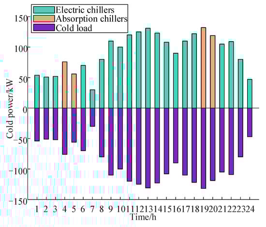 From the cold power optimization results in Figure 5, it can be seen that the energy required for the cold load is mainly provided by the electric chiller, which is because the electric chiller has lower operating costs than the gas turbine. When the waste heat generated by the gas turbine is not fully utilized by the heat exchanger, the absorption chiller uses the remaining waste heat to provide energy to the cold load at this time, avoiding the excess cost of the gas turbine due to heat dissipation.