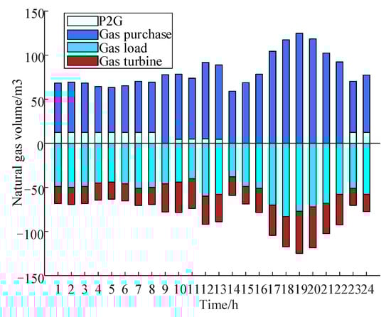 From the gas power optimization results in Figure 6, it can be seen that the electric-to-gas equipment mainly participates in system optimization and dispatch during the valley tariff, which is because, during the valley tariff, the operating costs of electric-to-gas equipment are lower than the costs of gas purchase, while during the peak tariff, the operating costs of electric-to-gas equipment are higher, so the energy required by the gas load mainly comes from the gas grid.