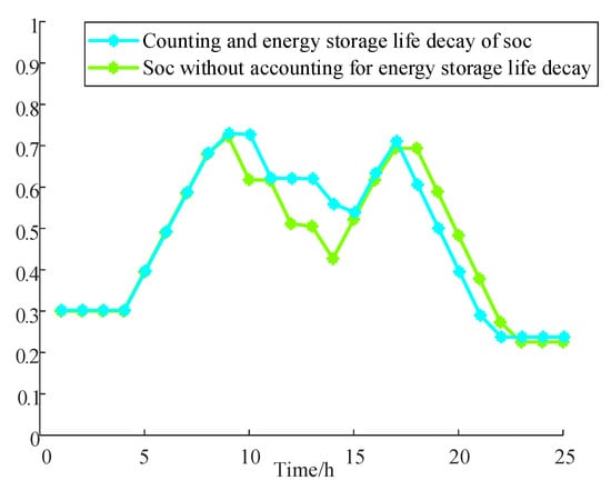 From the optimization results in Figure 7, Figure 8 and Figure 9, it can be seen that the battery charging power is equal to the discharging power in a scheduling cycle, and there is no simultaneous charging and discharging; when storage life decay is not taken into account, the stored energy is frequently charging and discharging, and the change is more drastic; the SOC curve after taking into account storage life decay is more gentle, and the relative charging and discharging depth is lower, which achieves the effect of shallow charging and shallow discharging and prolongs the service life of the stored energy.